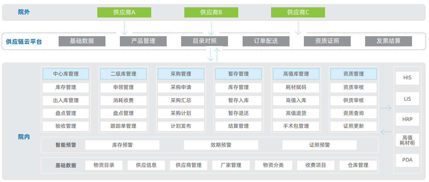 物資精細化管理系統(tǒng)從醫(yī)用物資的管理特點出發(fā),以“規(guī)范內(nèi)部管理、服務臨床一線及精細化管理”為目標,貫穿院內(nèi)外管理,實現(xiàn)耗材從科室需求、計劃采購、倉儲配送、二級庫管理到病人消耗使用的全流程閉環(huán)管理,并利用創(chuàng)新手段提升醫(yī)院對高值耗材管理、一般耗材管理、檢驗試劑管理、耗材成本控制、耗材采購與供應商協(xié)作等重點業(yè)務的管控能力,全面提升醫(yī)院耗材精細化管理水平,進而為醫(yī)院運營管理降本增效。