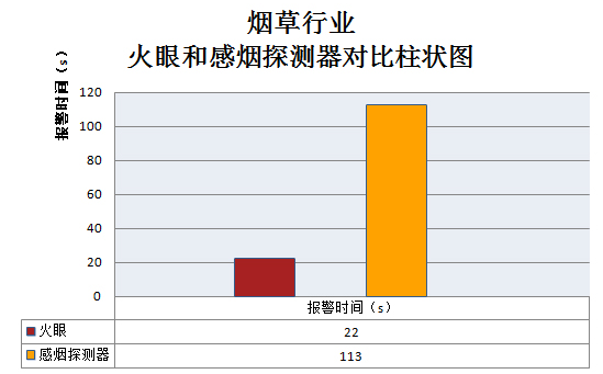 2014年“火眼”技術成功安裝于上海煙草集團,共做火焰測試46次,報警時間:14~62秒,平均時間:41秒;煙霧測試27次,報警時間:8~99秒,平均時間37秒。 “火眼”技術和煙草行業(yè)中不同場所使用的感煙探測器對比試驗5次: “火眼”技術平均報警時間:22秒; 感煙探測器報警時間:113秒。