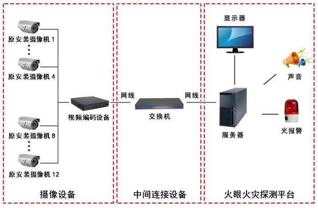 “火眼”可視圖像早期火災報警系統是應急管理部天津消防研究所歷時七年,研制成功的 一種利用視頻圖像分析技術、識別算法、能夠同時探測火焰和煙霧進行識別,做到10秒內報警系統。